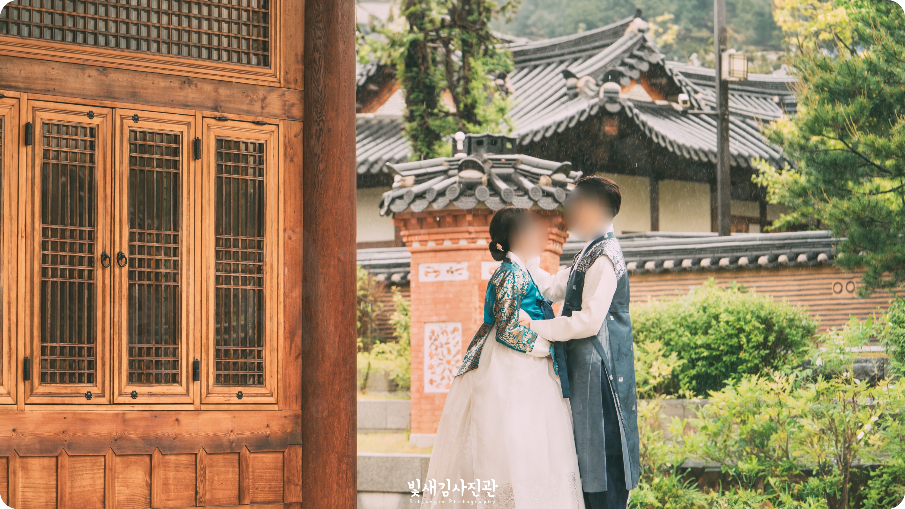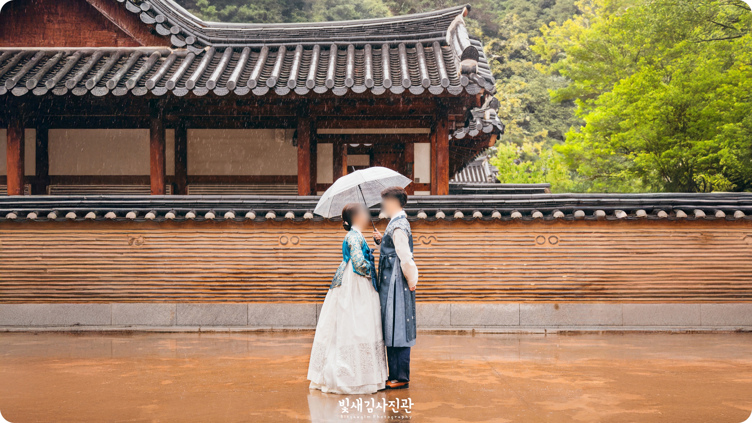 저 역시도 좋아하는 장소이고 신랑신부님께서도 야외촬영에 적극 동의해주셔서 저와 영상감독님이 준비해간 우비와 카메라 보호장비를 씌우고 욕심을 내보았습니다. 도무지 그칠 기미가 없었던 비에 저도 영상감독님도 신랑신부님도 모두 흠뻑 젖었지만 비오는 날의 경원재 한옥과 자연을 배경으로 하는 한 폭의 산수화 같은 느낌으로 담아드리려고 최선을 다했답니다.