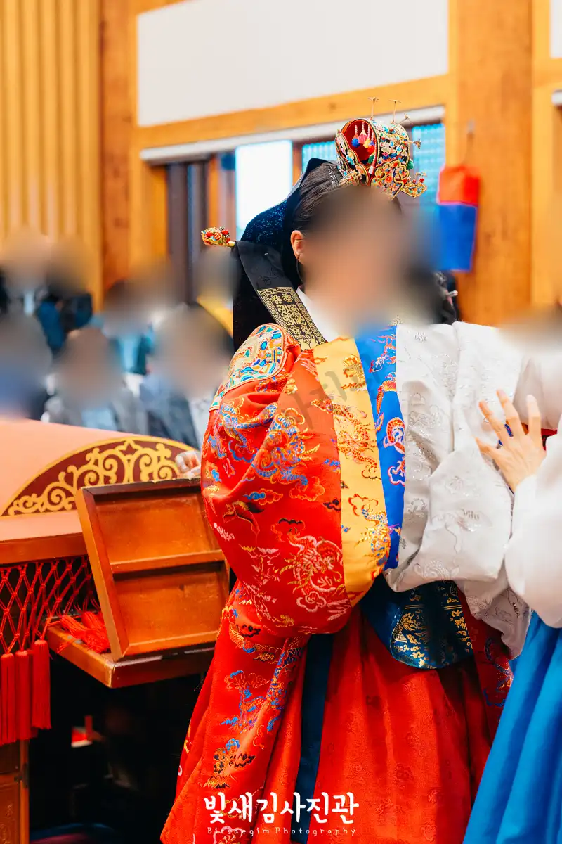 전통혼례의 경우 통상의 결혼식과는 사용하는 용어나 진행 방식에 차이가 있어서 사전 리허설에 시간이 꽤 많이 필요해요. 혼례진행을 맡아주신 한사랑우리혼례 집사님들께서 도와주시는데요. 리허설 이후 활옷으로 환복하고 바로 하객맞이에 들어가기 때문에 식전 한복스냅은 그 전에 가장 먼저 촬영 진행합니다. 한복스냅 촬영을 계획하신다면 준비 시간을 여유롭게 계획하시는 편이 좋습니다.