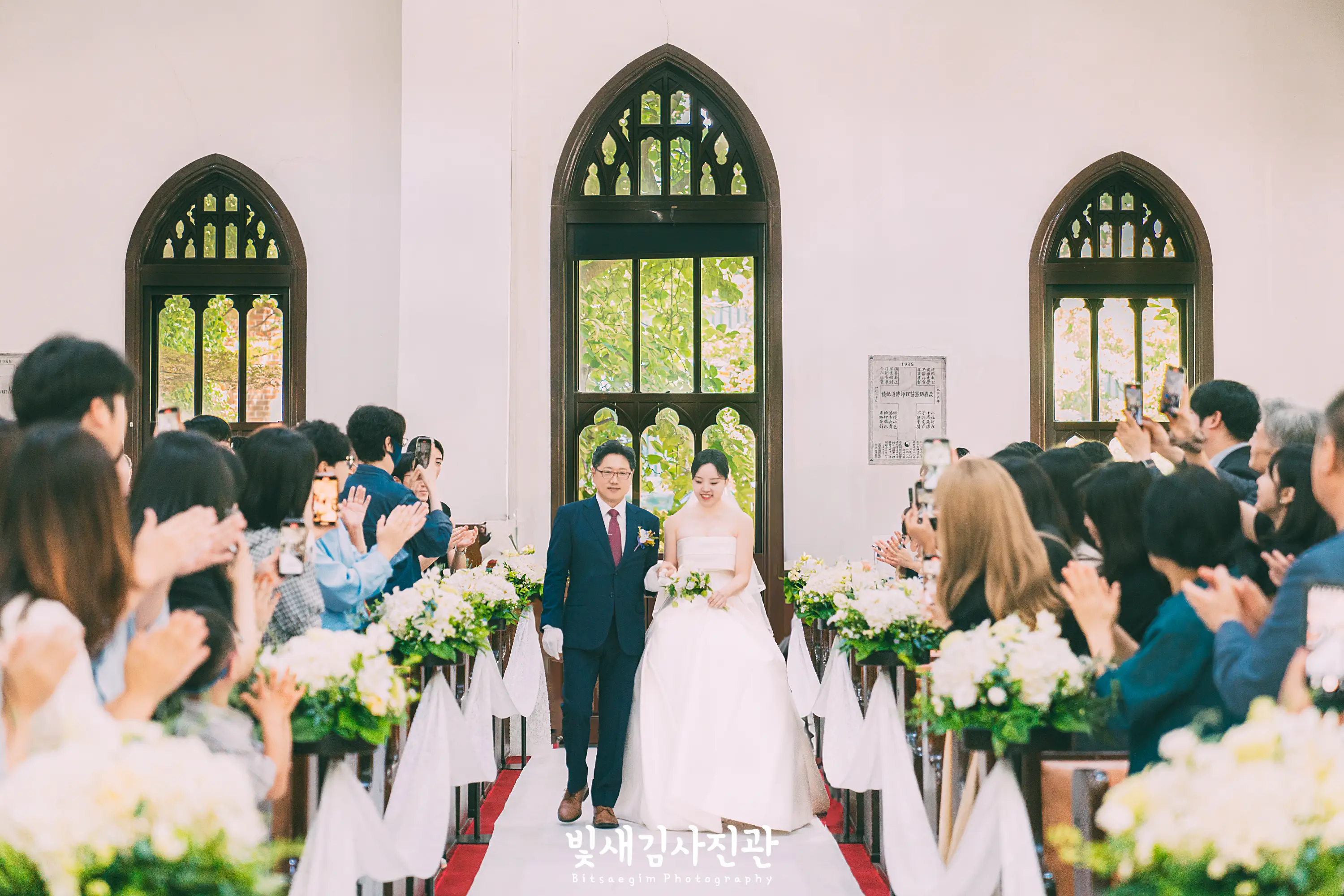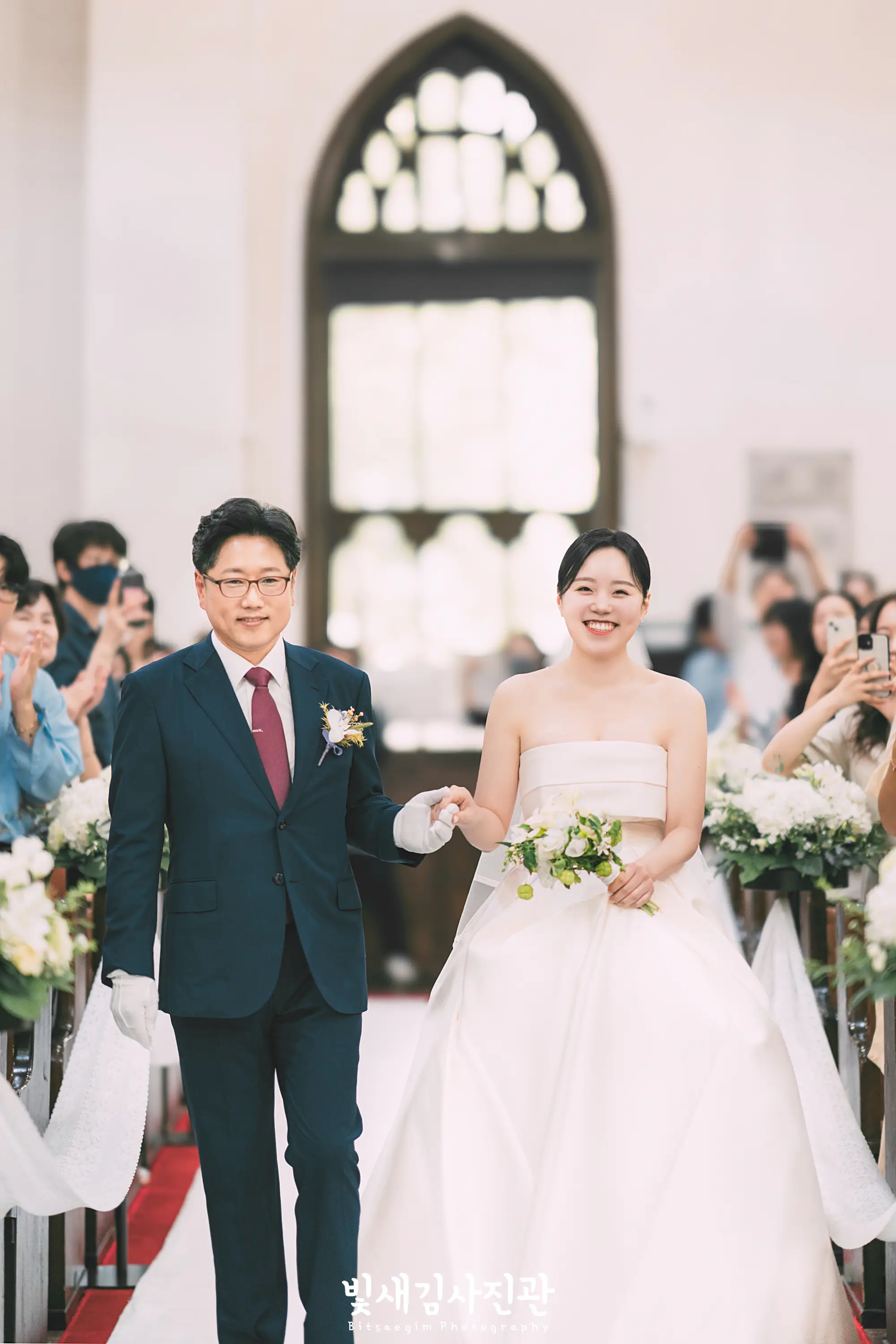 정동교회 결혼예배에서는 플라워샤워를 위한 꽃잎, 폭죽, 테이프 등 날리는 걸 금지하고 있어서, 버진로드에서의 별도 플라워샤워 연출은 진행하지 않았어요. 목사님께서 축도 진행해주신 이후 신랑신부님께서 버진로드 끝까지 행진하시는 모습을 자연스럽게 담고 마무리 지었습니다.