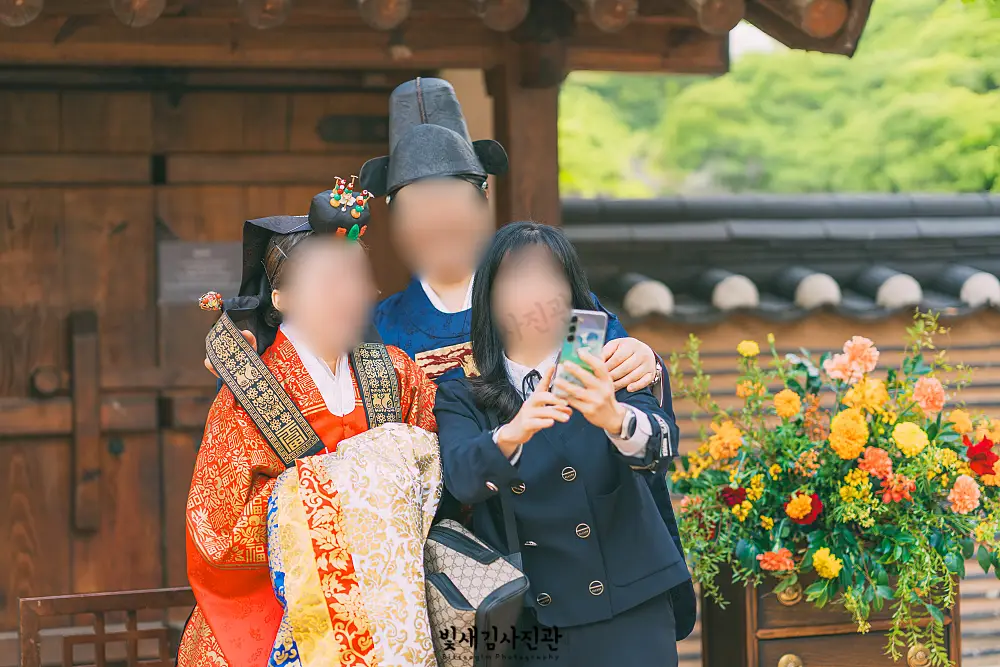 빛새김사진관이 진행한 전통혼례 본식스냅 촬영은 예식 2시간 전 활옷으로 환복하시기 전에 한복스냅 촬영부터 시작해요. 전통혼례는 통상의 서양식 웨딩보다 절차가 많고 한자로 된 용어들이 어려워서 리허설도 꽤 길게 진행하는데요. 그 과정에서의 신랑신부님과 가족분들의 모습들도 사진 남겨드리구요. 리허설과 준비시간이 꽤 걸리다보니 신랑신부님과 시간을 조정해서 촬영을 더 일찍 시작해요. 빛새김은 아름다운 경원재 한옥 이곳저곳을 배경으로 하는 스냅촬영을 꼭 진행하니 경원재 웨딩으로 결혼준비하시는 예비신랑신부님께서도 참고하시면 좋겠어요.
