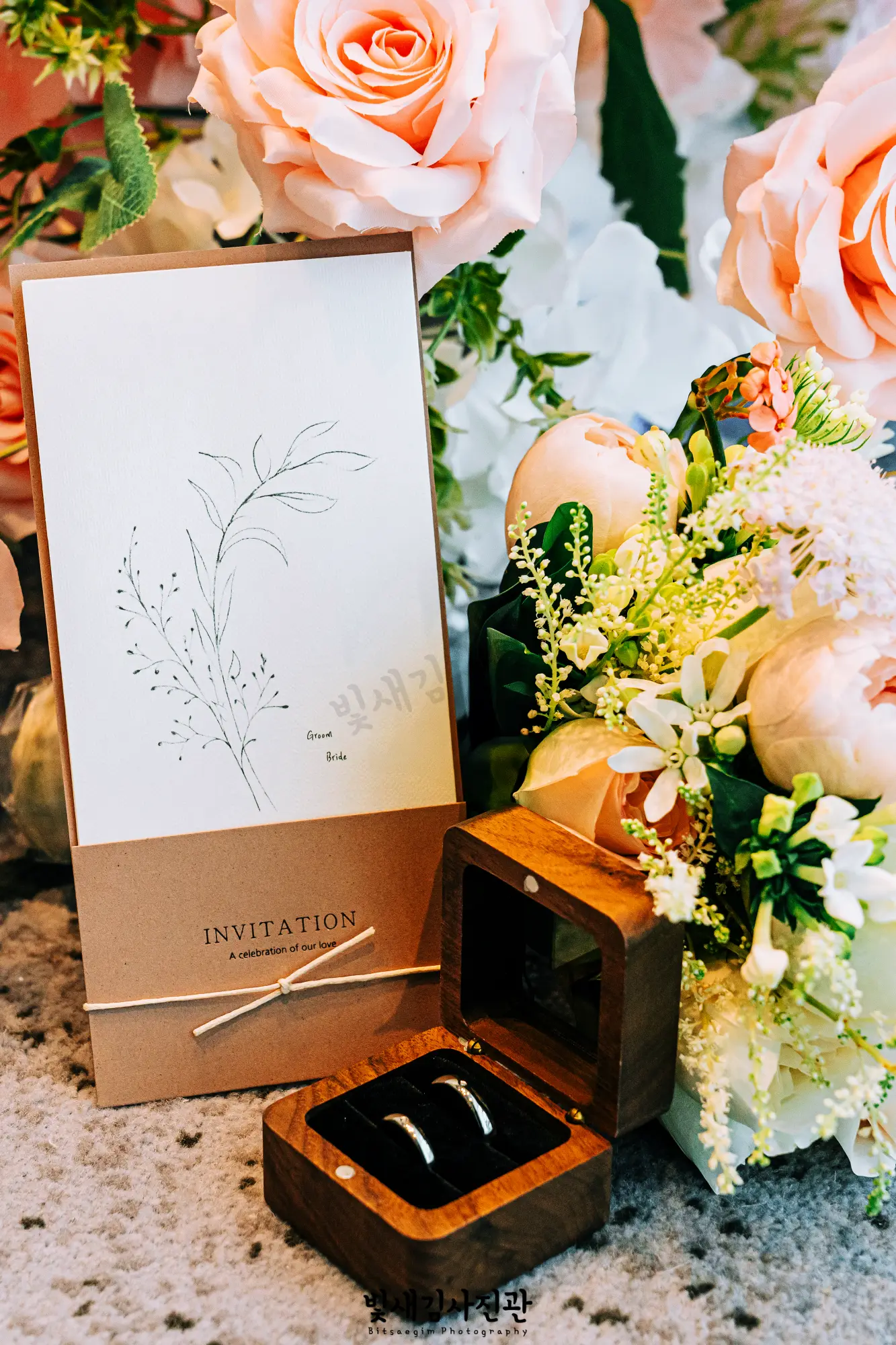 청첩장과 부케, 그리고 예물반지까지. 오늘 신랑신부님과 함께할 소중한 물건들까지 한 컷에 담아보구요. 원판 선촬영때 신랑신부님의 모습도 조금 더 가까이 다가가서도 촬영했어요.