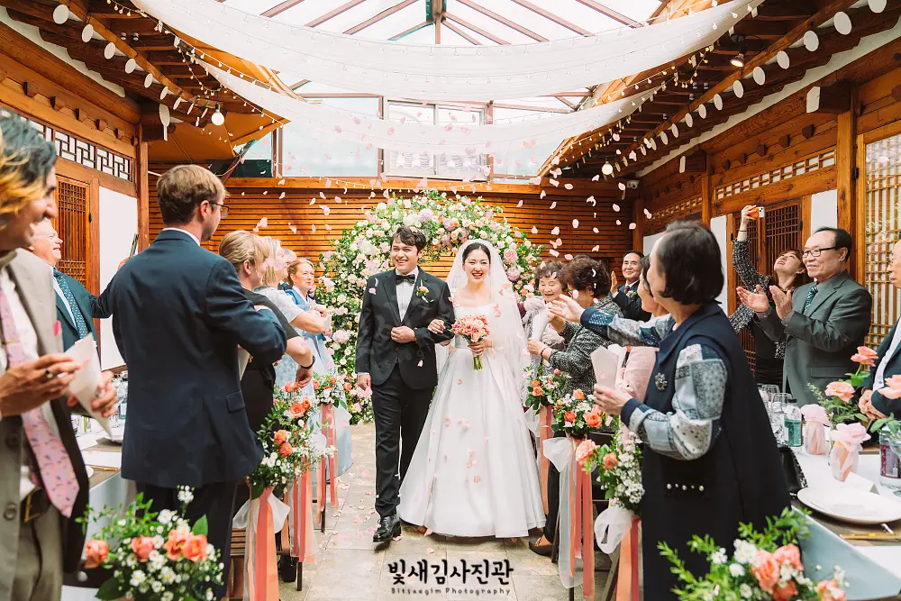 화창한 봄날 꽃내음 가득한 한옥 핸더스에서 진행된 결혼식. 빛새김사진관이 신랑신부님의 소중한 하루를 함께하며 아름다운 순간들을 담아왔습니다. 핸더스는 직계가족예식이나 50명 규모