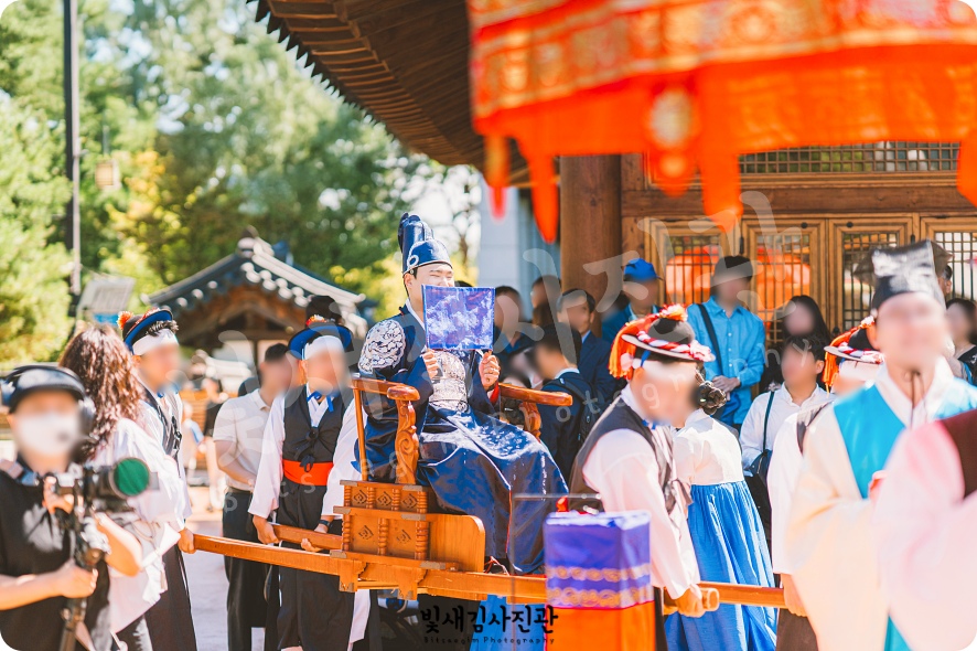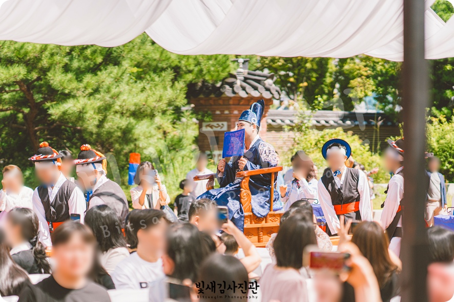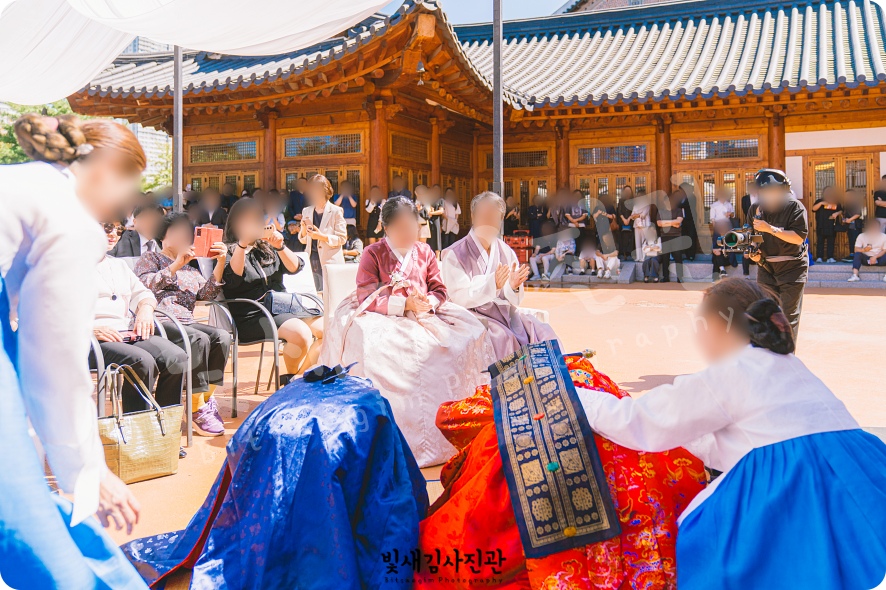 1시간 가량의 경원재 식전 한복스냅 촬영을 마치고, 혼례복으로 갖춰입으신 후 본격 혼례가 시작됩니다. 야외공간에 마련된 대기실 장소에서 가족분들과 하객분들을 모시고 기념사진 촬영으로 출발하구요. 예식 시작시간에 맞춰 전통혼례 집례님의 진행에 맞춰 전통결혼식 본식도 촬영 쭉 이어집니다.