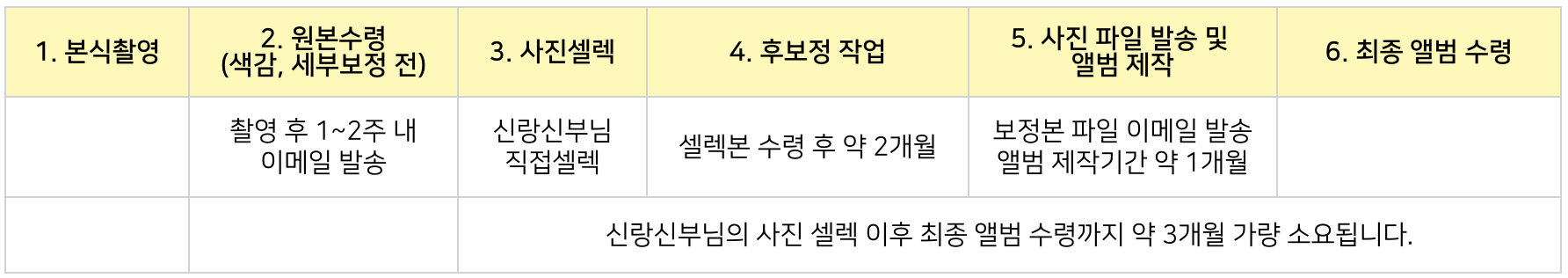 - 보정 기간 : 셀렉 후 약 2개월, 이후 앨범제작시 실물제작과 검수에 1개월 가량 추가로 소요됩니다.