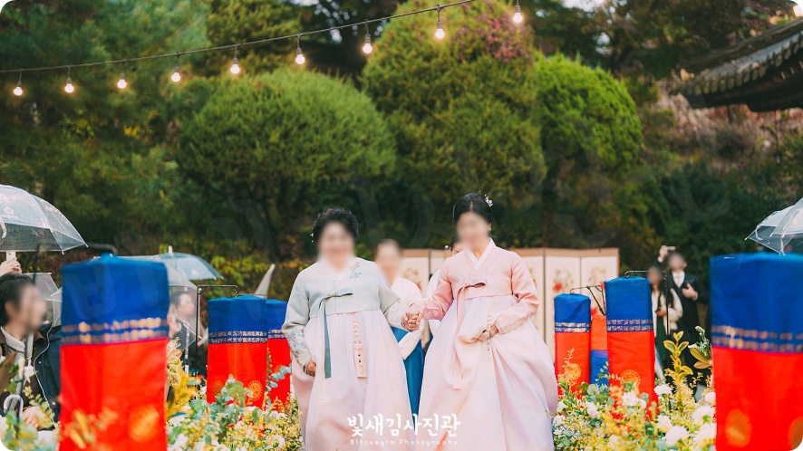 늦은 오후 예식이라 밝은 주간에 시작해 전통혼례가 마무리될 때 쯤엔 해가 져 어두워집니다. 야간에 진행되는 야외결혼식만의 특징이기도 한데요. 시간이 흐르며 바뀌는 빛의 방향과 전체적인 분위기 변화까지. 주간부터 야간 저녁으로 이어지는 사진 색감과 분위기도 함께 확인해보실 수 있을 것 같아요.