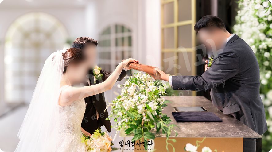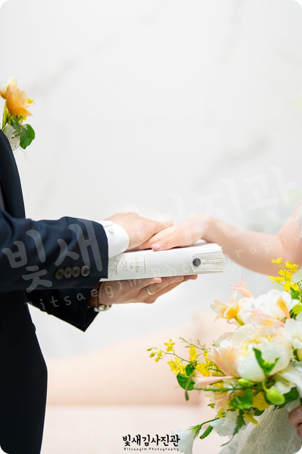 그리고 결혼예배스냅에서 빼놓을 수 없는 장면, 바로 성경 위에 손을 얹고 서약하는 모습이죠. 이 장면은 부모님들도 나중에 사진으로 보시고 참 좋아하시는 컷이에요. 한 가정이 믿음의 반석 위에 세워지는 증거 같은 사진이니까요. 빛새김사진관만의 이런 시그니처 컷들은 제가 수많은 예배 예식을 촬영하며 정립해온 데이터의 산물이라 자부합니다.