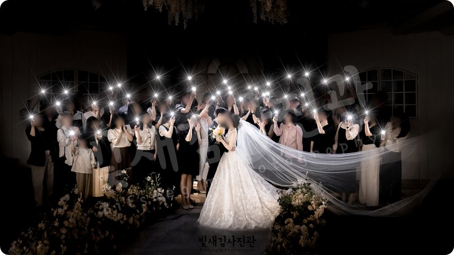 포레스트원본식스냅의 하이라이트는 역시 원판 촬영 마지막에 진행되는 플래시 컷이에요! 어두워진 홀에서 하객분들이 휴대폰 플래시를 켜고 두 분을 비춰주면, 마치 밤하늘의 별들이 쏟아지는 것 같은 몽환적인 사진이 완성되거든요. 이 사진을 보고 많은 분이 "정말 빛나는 순간을 담아주셨네요"라고 말씀해 주실 때 작가로서 가장 큰 보람을 느껴요.