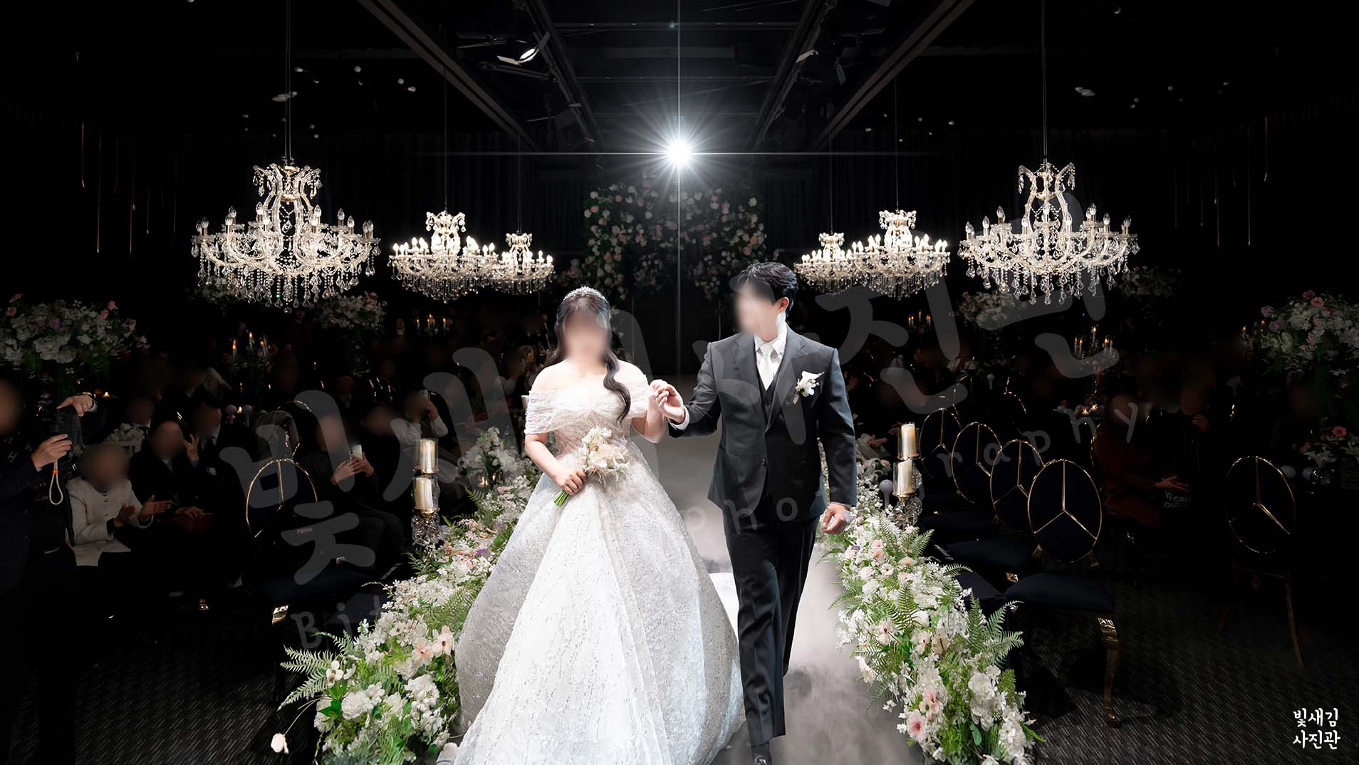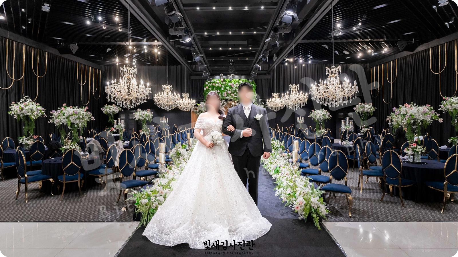 • 버진로드 위로 쏟아지는 화려한 샹들리에 조명 활용 기법.