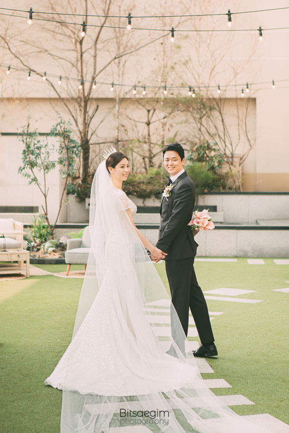 신부대기실 입장하시기 전에 웨딩홀 한켠에 마련된 야외정원에서 연출사진들도 촬영했어요. 야외촬영 느낌도 낼 수 있어서 예쁜 사진 찍기 좋은 곳!
