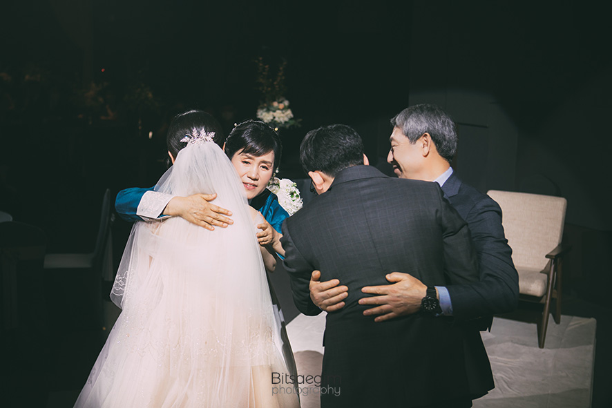 예식의 막바지, 부모님께 인사드리는 시간은 화정베네치아본식스냅 촬영 중 가장 집중력이 높아지는 순간이에요. 신부님이 눈물을 참으려 애쓰는 모습, 아버님이 사위를 꽉 안아주시는 모습. 이런 장면들은 연출로 절대 만들 수 없는 '진짜' 감정이잖아요. 저는 최대한 방해되지 않게 멀리서 망원 렌즈로 그 감정의 깊이를 담아내요.