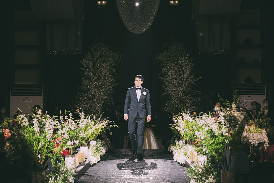 신랑님의 당찬 입장과 아버님 손을 잡고 들어오는 신부님의 모습. 이 순간은 언제 봐도 뭉클해요. 제가 수백 번의 결혼식을 촬영했지만, 매번 이 장면에서는 카메라 뷰파인더 너머로 같이 울컥하곤 한답니다. 특히 베네치아웨딩은 버진로드가 적당히 높고 길어서 다양한 각도에서 신랑신부님을 담기에 아주 좋아요.